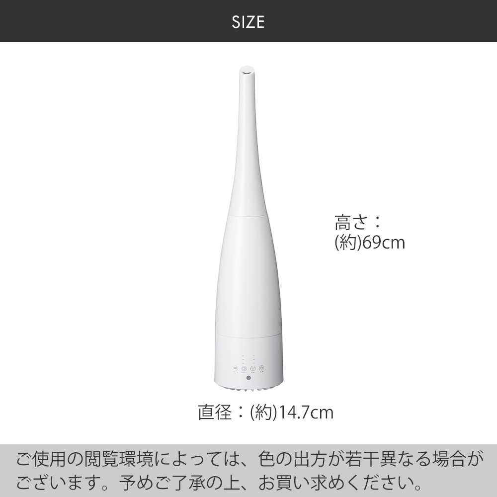 オブジェのような美しいフォルムが印象的なデザインで約69cmの高さから最大250ml/hのミストを勢いよく噴霧することによって効果的にお部屋全体を加湿します。