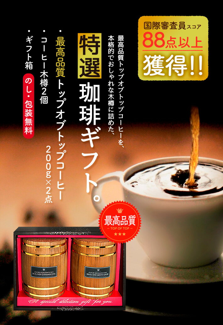 原材料 珈琲豆 商品説明 最高級&最高品質!国際審査員スコア88点以上獲得のトップオブトップ コーヒー2点 木樽ギフト!のし、包装も無料で対応いたします。