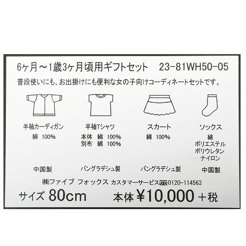 メーカー希望小売価格はメーカー商品タグに基づいて掲載しています.商品名6ヶ月〜1歳3ヶ月頃用ギフトセット(女の子)ブランドCOMME CA ISM生産国中国 バングラデシュサイズ表記サイズー80cm素材綿100%ソックス:綿 ポリエステル ポリウレタン ナイロンカラーブラック系【モニタの環境によって色が異なる場合があります】コンディション新品未使用・箱あり。