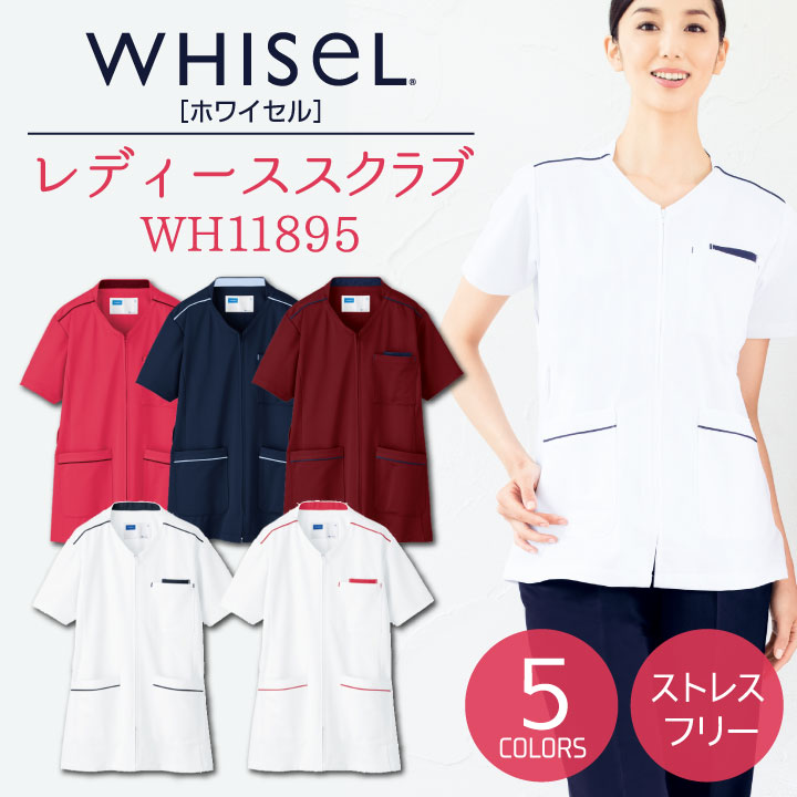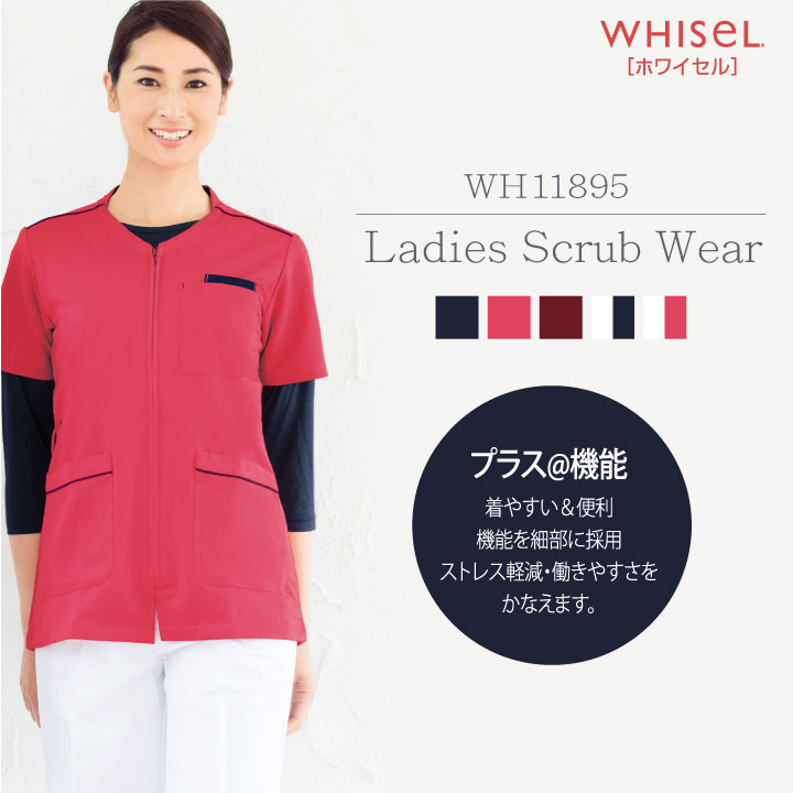 【エントリーで10倍】レディーススクラブ ホワイセル WHISEL ファスナー 半袖 おしゃれ チームスクラブ 白衣 女性 工業洗濯対応 jd-wh11895